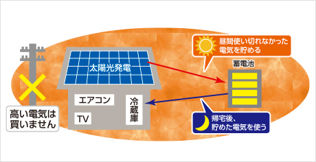 昼間の電気料金は割高のため、蓄電池に蓄えた電気を使うとお得に。停電時も安心して使えます。